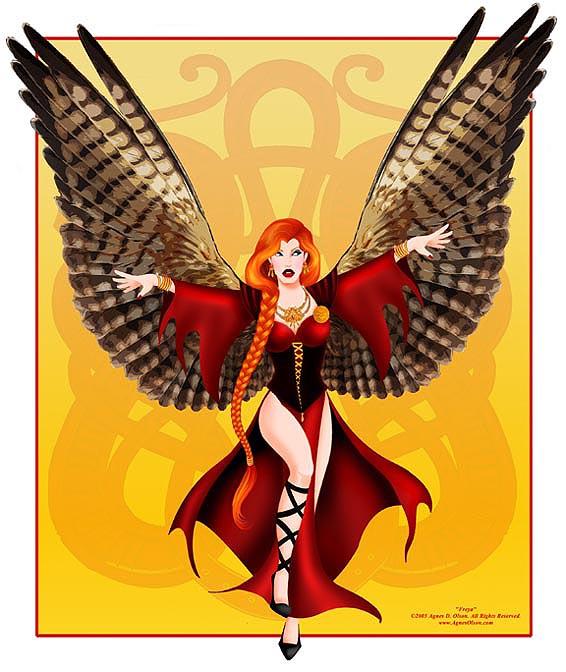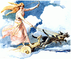 Freya can be considered a female jack of many trades amongst the deities, as she is a goddess of love, beauty, sexuality, fertility, magick, witchcraft, enchantments, hidden knowledge, warfare and self-defense, and a mistress of cats. Her physical beauty and sensuality rivals that of the Greek goddess Aphrodite, and her natural affinity with the feline species is comparable to that of the Egyptian goddess Isis. She has a strong warrior aspect to her and can be called upon in that capacity for fierce protection--an aspect of hers in which she is sometimes referred to as 'Freya of the Black Swordhand'--and as the name of this aspect of hers would suggest, she wields a sword with fearsome alacrity in combat. However, more often she is invoked for her purview over romance and carnal pleasures, and as such she can be seen as a patron goddess of all girls and women who are proud of their natural sexuality, and who are not afraid to make this point known despite the double standards inherent in modern society thanks to the continuing influence of the Victorian mentality. Her ability to cast enchantments and to work wonders over the natural forces of the cosmos via her great magickal skills are useful to all practitioners of the mystic arts who may call upon her to enhance the effectiveness of their own prayers and workings; as such, Norse Wiccans consider the famed ancient occult symbol--the five-pointed star known as the pentagram--to be her official symbol. She is an unequaled mistress of the ancient Norse magickal art referred to as sheide (pronounced 'she'), and many female practitioners of sorcery in the ancient Norse culture were her mortal acolytes in the practice of this powerful form of magick. Freya was the only member of the Norse pantheon other than Odin himself to have knowledge of the ancient symbols of power and divination known as the runes, but unlike Odin she didn't have to engage in the torturous trials that he did in order to gain this runic mastery.
